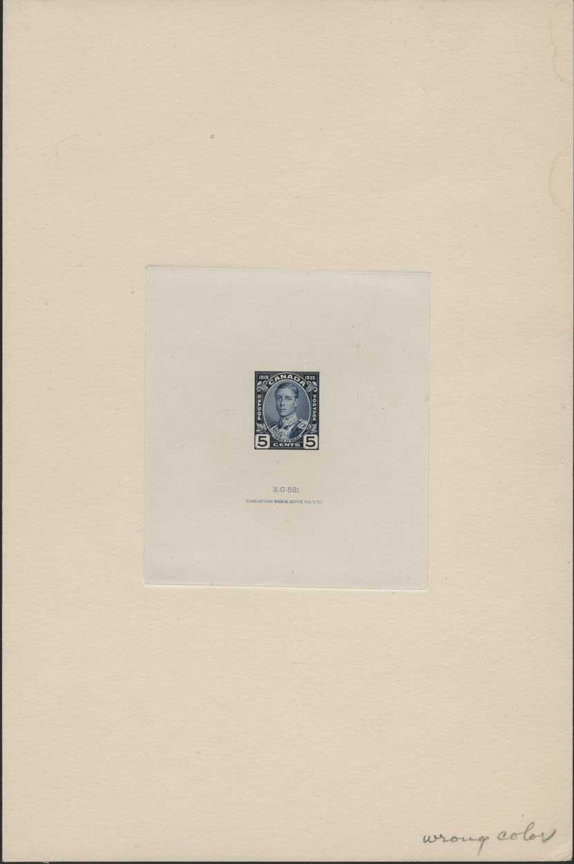 #214P, 1935 5c Jubilee, large die proof on India sunk on full sized 152x228mm card, with die number "XG591" and "Canadian Bank Note Co. Ltd." imprint, pencil notation at bottom right states "wrong color," fresh and extremely fine.