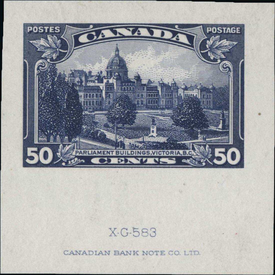 #226P, 1935 50c Dull violet, large die proof on India removed from card, 41x41mm, with die "XG-583" and "Canadian Bank Note Co. Ltd." imprint, very fine and scarce.