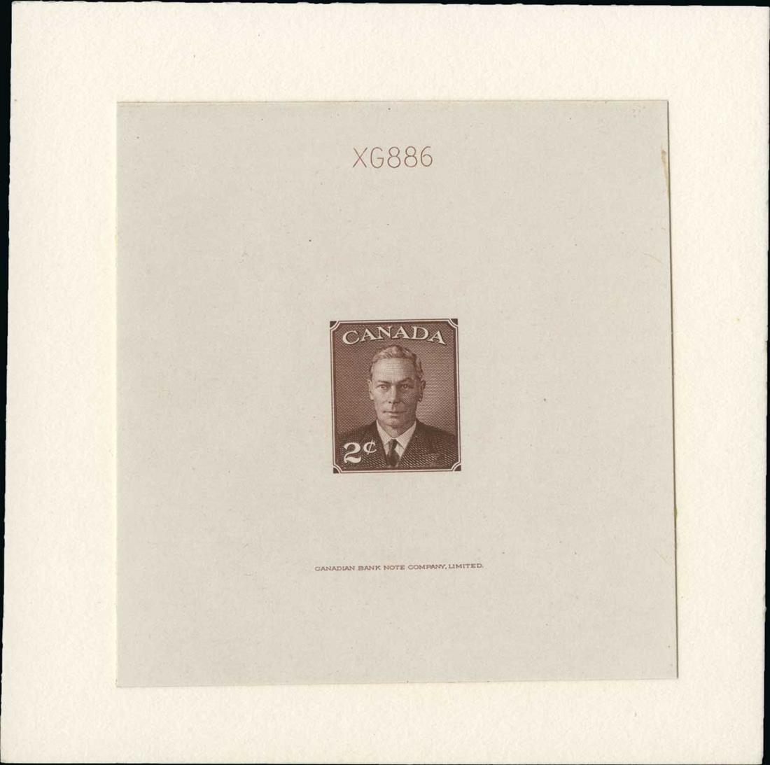 #290P, 1950 2c George VI, trial color large die proof in Red brown printed directly on 74x76mm card, with die number "XG886" at top and "Canadian Bank Note Company Limited" imprint below, extremely fine and very rare.
