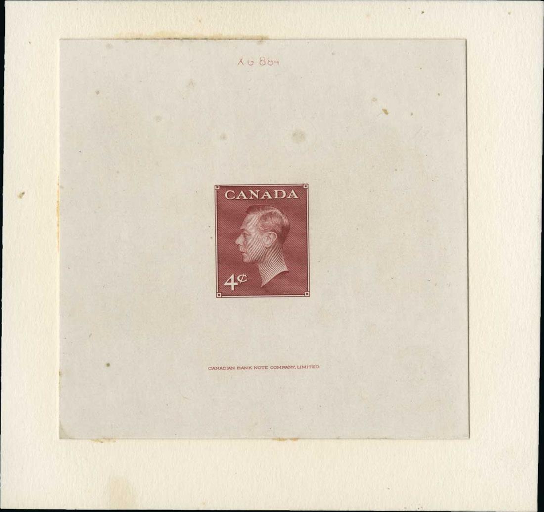 #292P, 1950 4c Dark carmine, large die proof printed directly on 74x73mm card, with die number "XG884" at top and "Canadian Bank Note Company Limited" imprint below, couple faint spots well away from stamp, very fine and rare.
