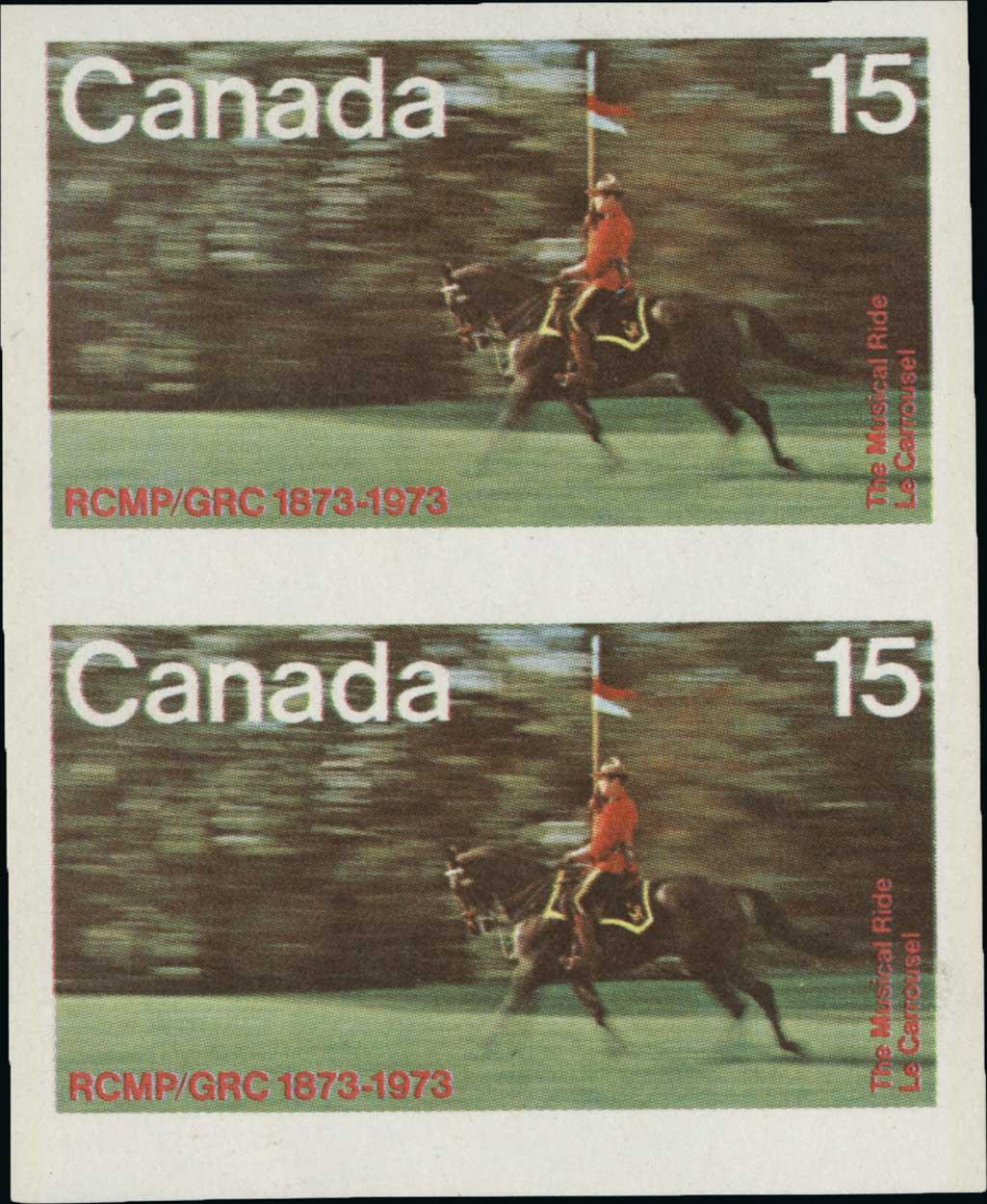 #614a, 1973 15c R.C.M.P Musical Ride, imperforate, vertical pair without the wrinkles that frequently occur, o.g., n.h., very fine (Unitrade C$600.00).