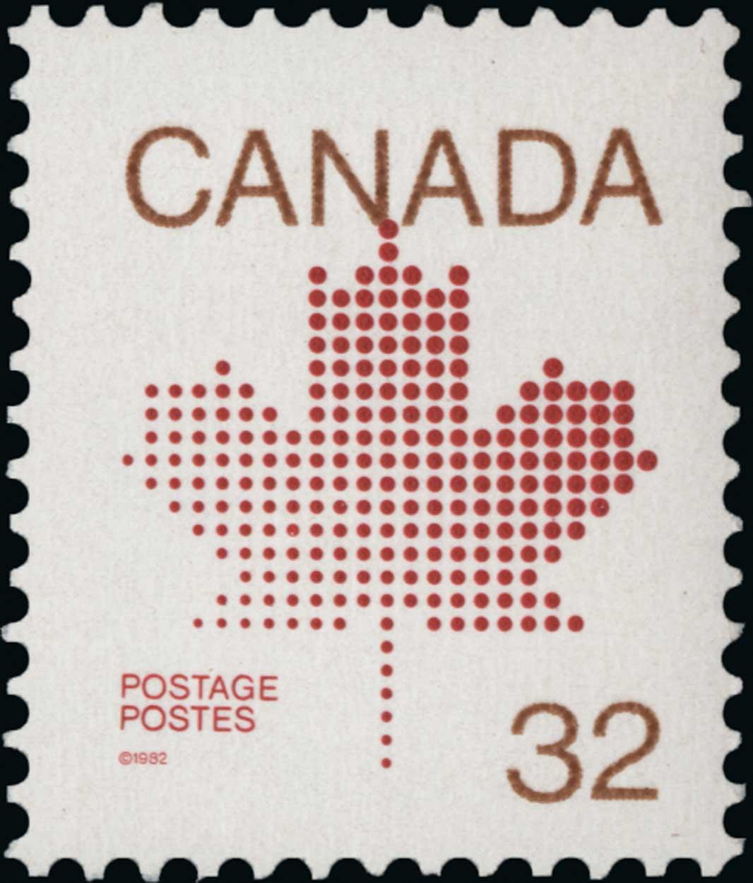 #924c, 1983 32c Maple Leaf, beige and tagging omitted, on Abitibi paper with white gum, o.g., n.h., very fine; only 150 have been discovered (Unitrade C$1,500.00).