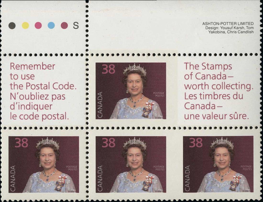 Unitrade 1164aii, 1164a, 1988 38c Queen Elizabeth, imperforate between and imperforate between stamp and label, the top four stamps and two labels from an improperly cut booklet pane of ten with tab at top, o.g., n.h., with usual adhesion in tab, very fine and rare;