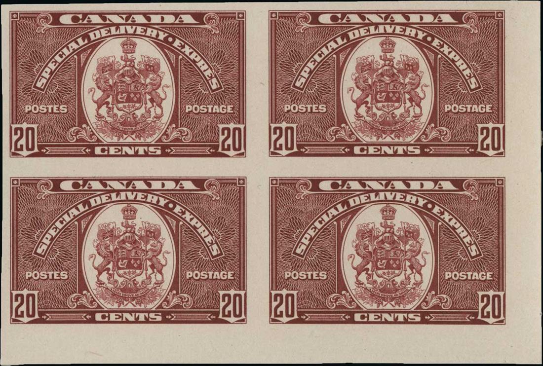 Unitrade #E8P, 1938 20c Dark Carmine Special Delivery, plate proof on India mounted on card, bottom right corner margin block of four, with large margins on the other two sides, fresh and very fine.