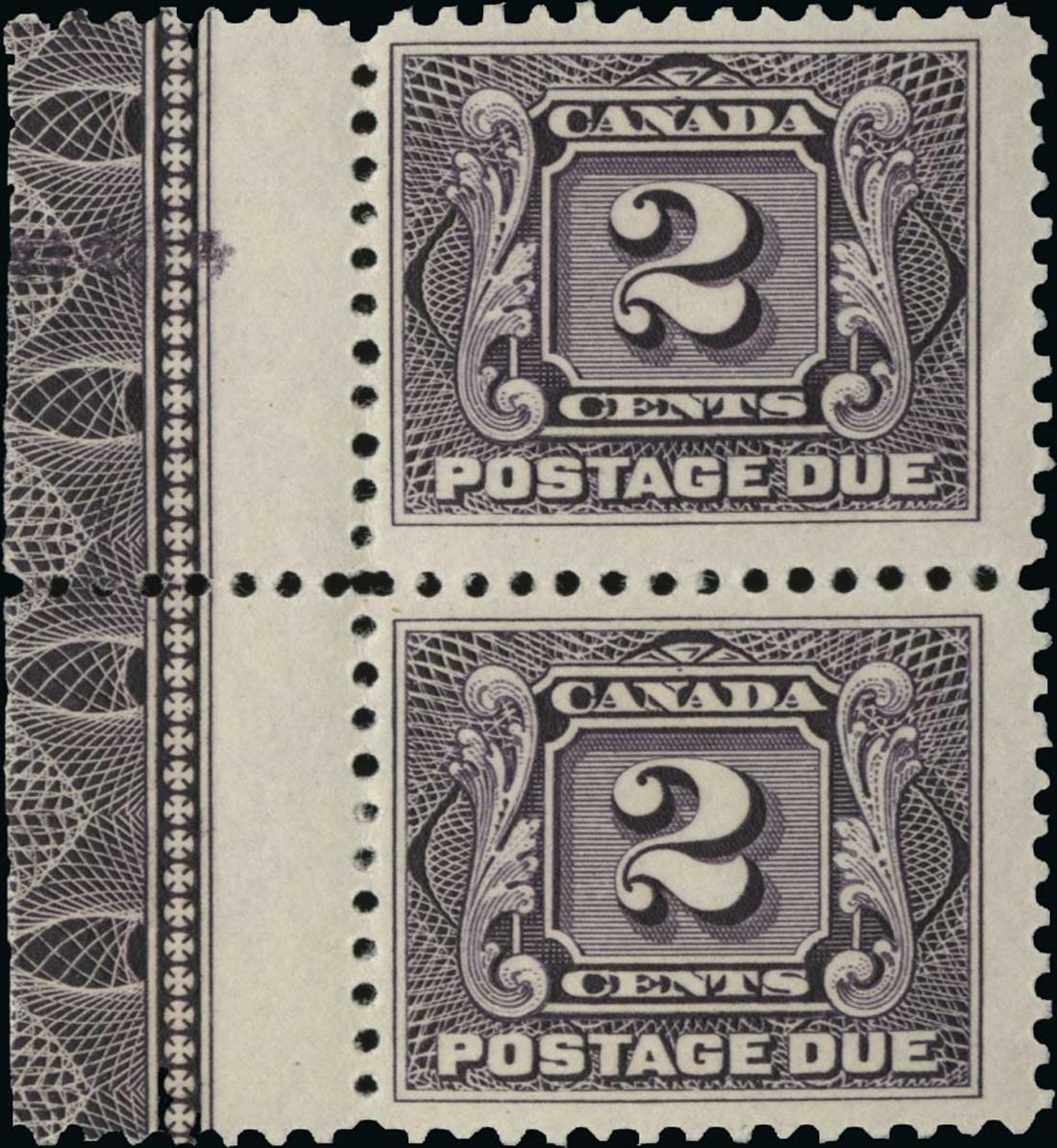 Unitrade #J2 LW A, 1906 2c Violet Postage Due, lathework Ty. A, left sheet-margin vertical pair showing 100% lathework impression, o.g., n.h., fresh and fine;