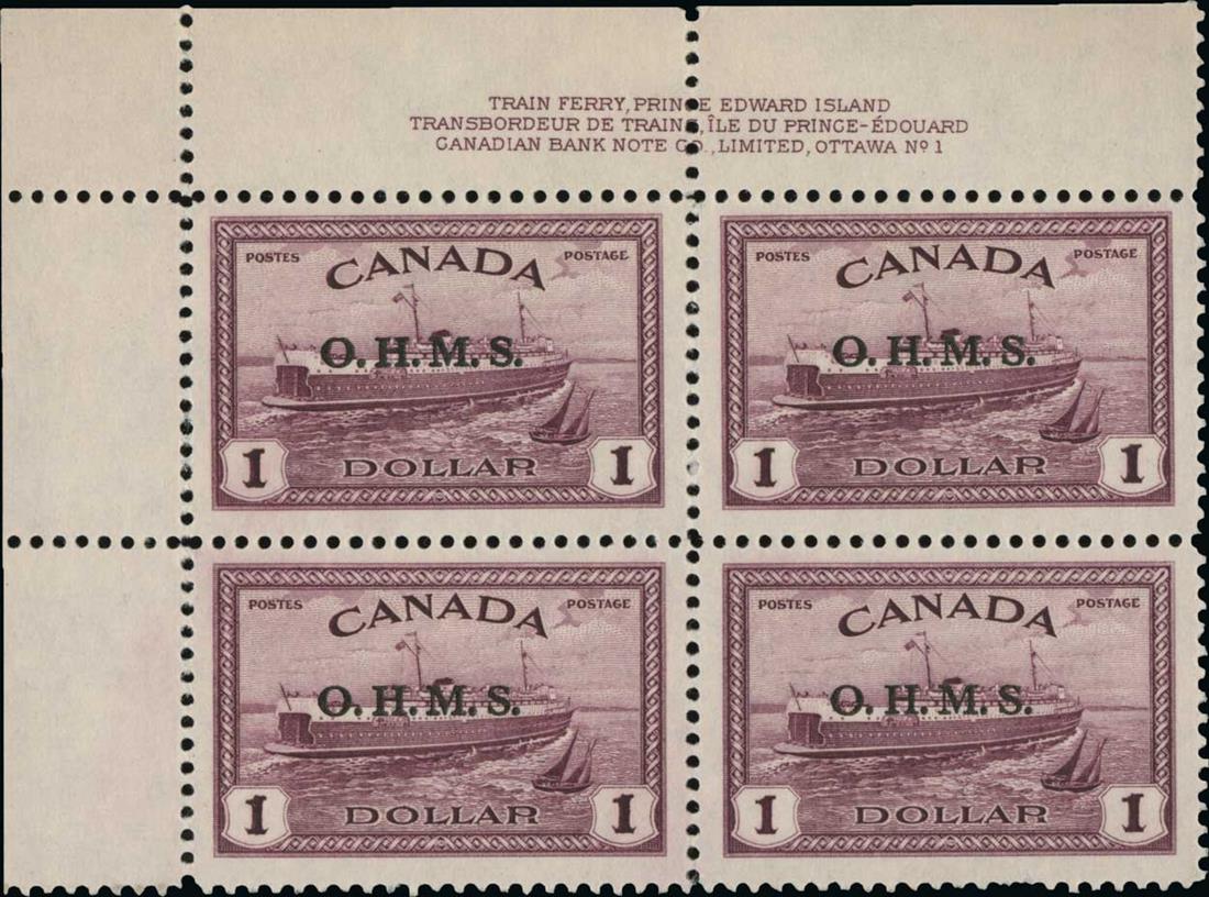 #O10, 1949 $1.00 Ferry, "O.H.M.S." overprint, top left corner margin plate block of four, o.g., n.h., bottom right stamp with a couple nibbed perfs., otherwise very fine (Unitrade C$600.00).