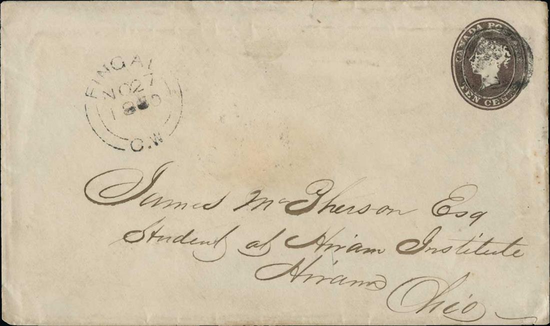 Unitrade #U2, 1860 10c Dark brown entire, used with cork cancel and matching "Fingal CW/No 27, 1860" datestamp to Hiram, Ohio, three backstamps including Great Western Railway, very fine and scarce first stationery issue to pay the 10c rate to the U.S.; 2004 Greene Foundation certificate.
