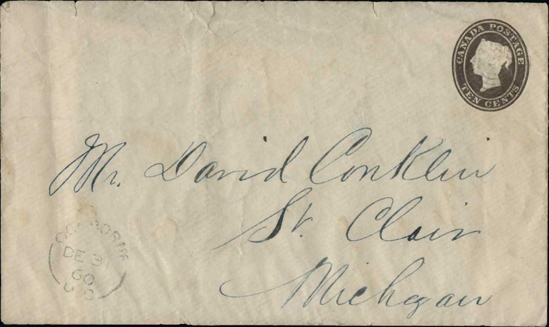 Unitrade #U2, 1860 10c Dark brown entire, used with split ring "Colborne UC/De 31, 60" datestamp to St. Clair, Michigan, flap mostly missing and a few light wrinkles and short tear, a fine and scarce usage of the first entire paying the 10c rate to the U.S.;