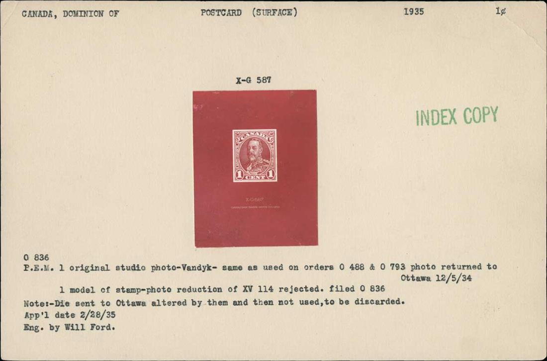Unitrade #UX57E, 1935 1c Carmine "front face" essay on glossy thin red card with die number "X-G-587" and "Canadian Bank Note Co. Ltd" imprint, mounted on 227x150 mm card with typewritten notes including "Postcard (Surface)" and "Die sent to Ottawa altered by them and then not used, to be discarded" as well as handstamped "Index Copy," very fine and believed to be unique.
