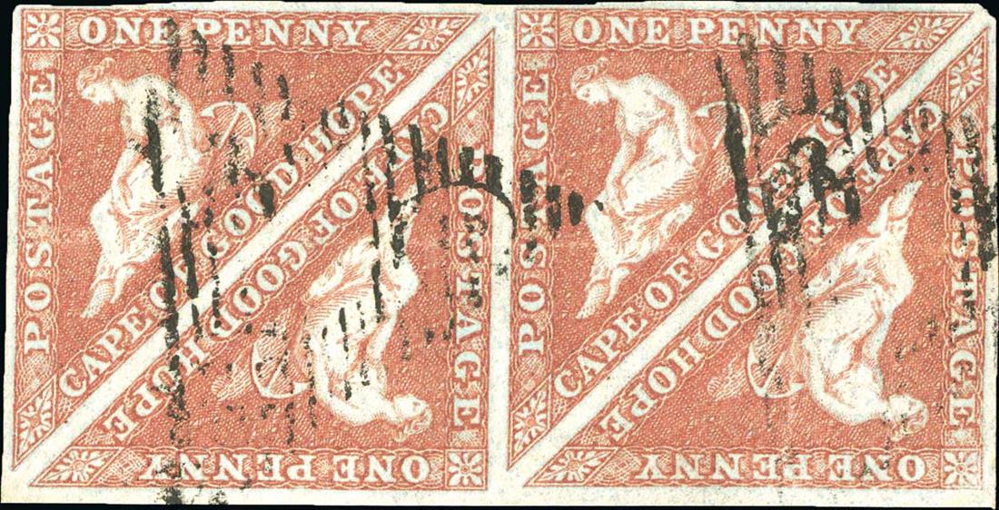 #1, 1853 1d Brick red on slightly blued paper, a used horizontal block of four, ample to large margins all around, neatly cancelled by two strikes of large triangle obliterator, horizontal crease, otherwise very fine and attractive (S.G. #3, £1,400).