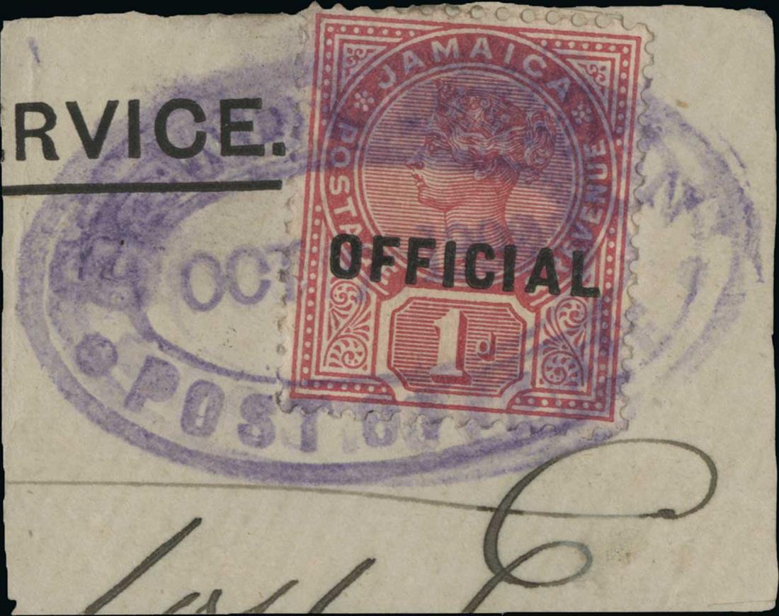 #A8, 1889-94 Jamaica 1890-91 1d Carmine rose overprinted "OFFICIAL," a desirable example being tied to piece by purple double oval "GRAND CAYMAN/POST OFFICE/OCT 7 1890" datestamp, very fine and rare; fewer than ten examples are recorded with this cancel, 1993 RPS and 1994 BPA certificates (S.G. #Z16; £1,500).