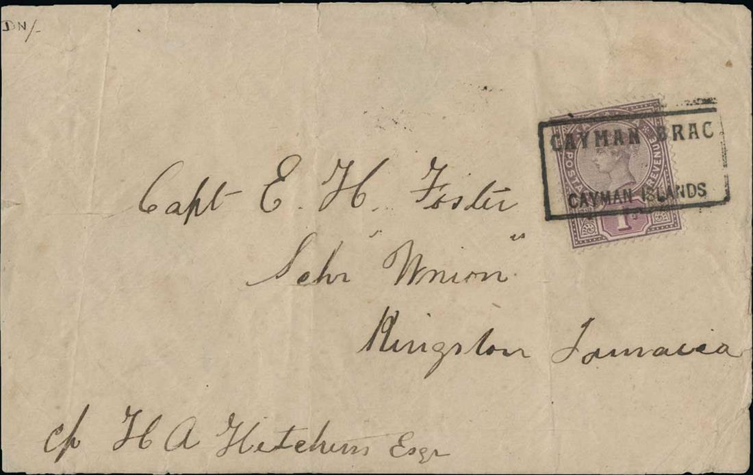 #A22, 1898-1900 Jamaica 1889 1d Lilac and red violet, well centered single tied to cover to Kingston, Jamaica by a superb strike of boxed "Cayman Brac/Cayman Islands" Ty. I handstamp, addressed to a Captain E. H. Foster, "Kingston/Sp 6, 99/Jamaica" backstamp, couple light vertical folds to cover not affecting the adhesive and a bit reduced at left, still very fine for this major rarity of Cayman Islands philately, with only six covers recorded with this cancel;