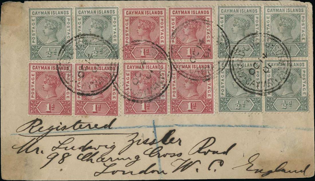 #1-2, 1900 ½d Pale green and 1d Carmine rose, blocks of four and horizontal pairs of each, tied to registered cover to London by double ring "Grand Cayman/Cayman Islands/Oc 14, 01" Ty IIIa datestamps, Jamaica and London backstamps, minor corner staining and one ½d small fault, still a fine and scarce first issue usage;