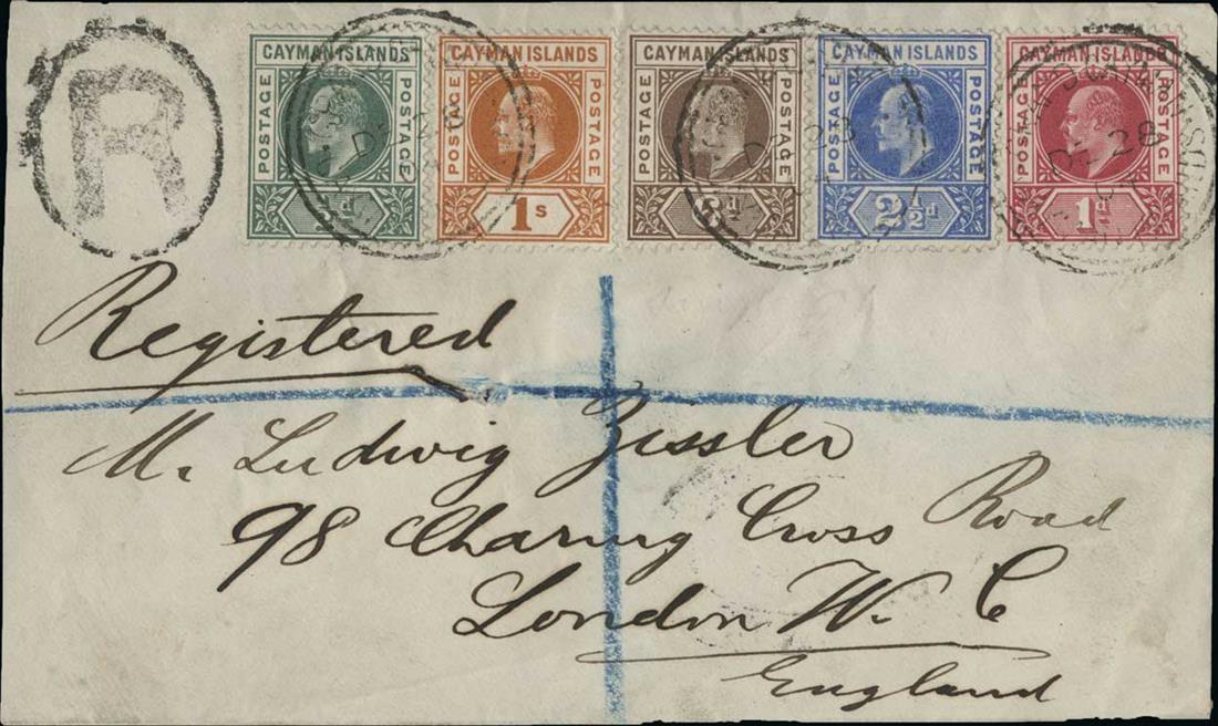 #3-7, 1902-03 ½d to 1/- King Edward VII first series, complete set tied to small registered cover to London by three strikes of "Grand Cayman/De 28, 04/Cayman Islands" Ty. IIIa datestamps, "R" in oval handstamp at top left, Jamaica transit and London arrival backstamps, cover with small spindle hole, very fine; a colorful complete set cover;