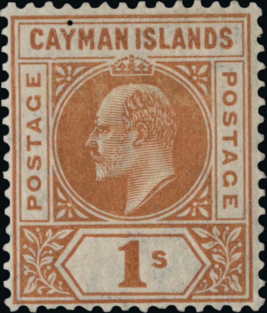 #12a, 1905 1/- Brown orange, dented frame variety, the so-called Glover flaw from pos. L 1/6, fresh and well centered, o.g., very fine; a rare variety of which only 74 were printed (S.G. #12a; £650).