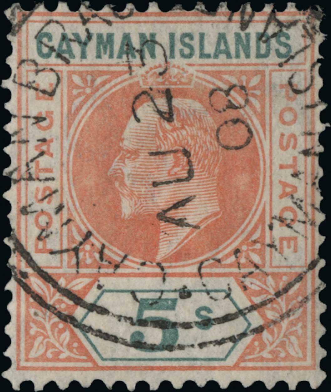 #13-15, 1907 4d to 5/- King Edward VII third series cplt., select used set, neat c.d.s. cancels, the 5/- with a nearly complete strike of the scarce Cayman Brac datestamp, very fine; much scarcer used than mint (S.G. #13-16; £500).