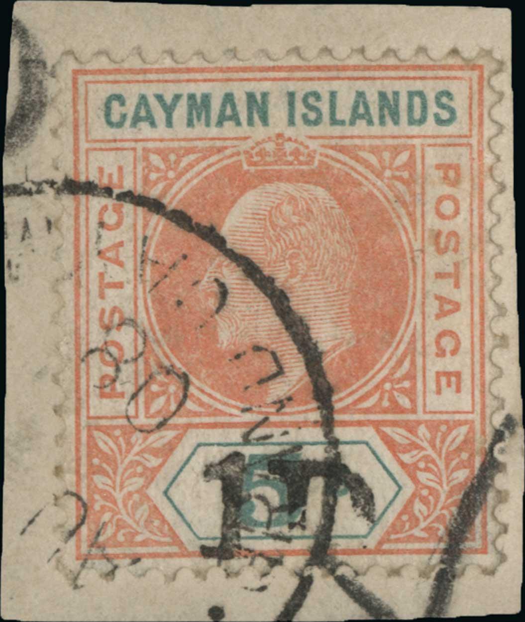 #19, 1907 "1D" Surcharge on 5/-, tied to small piece by neat August 1908 datestamp, well centered, very fine and scarce used (S.G. #19; £400).