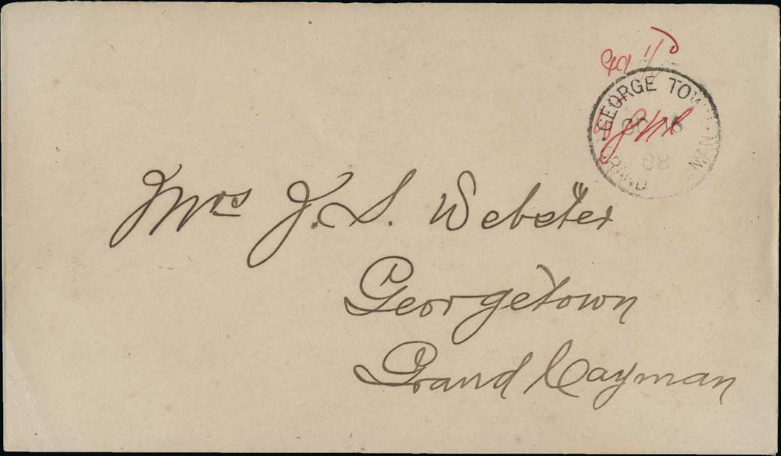 S.G. #MP2, 1908 "Pd ¼d/WGMcC" red manuscript provisional on fresh locally addressed cover cancelled by "George Town/Oc 16, 08/Cayman Islands" datestamp, very fine; this marking was used from 4-27 October 1908 during a shortage of stamps and this endorsement was applied by the new Postmaster, William G. McCausland.