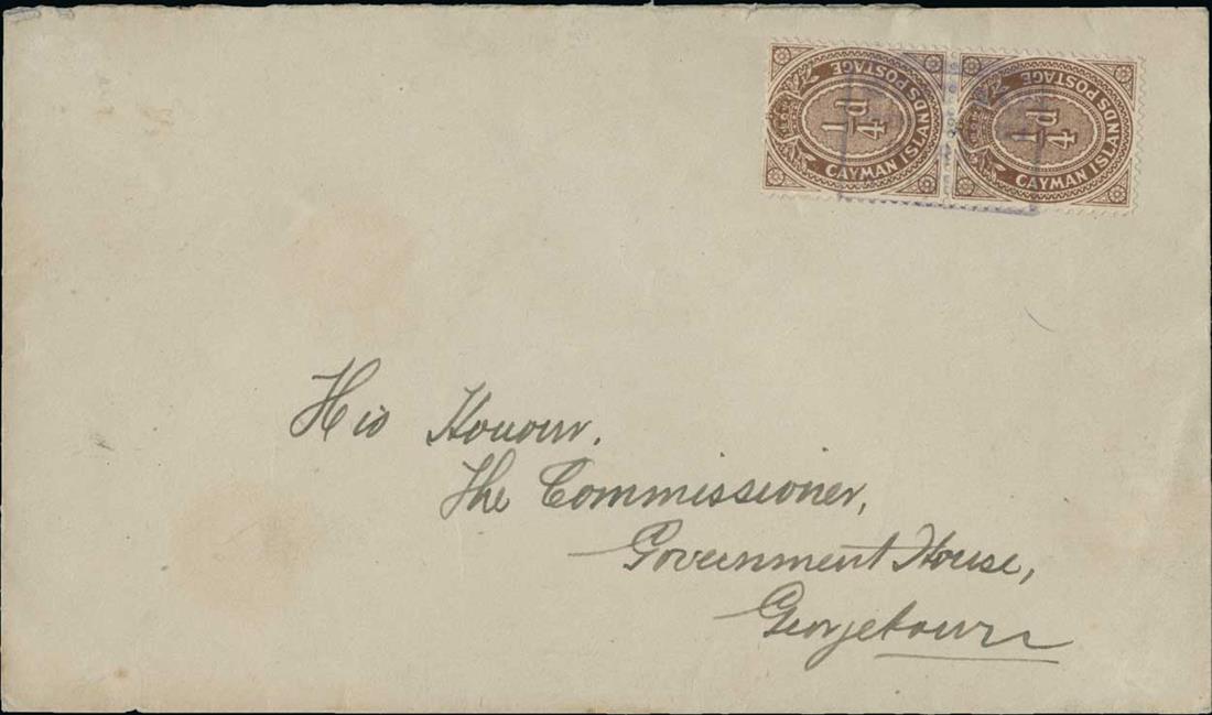 East End/Grand Cayman/Rural/Post Collection violet boxed handstamp Ty. RP2 tying a vertical pair of 1908 ¼d Brown (#31) to clean cover addressed to "His Honour, The Commissioner, Government House, Georgetown," reverse with clear Georgetown, November 27, 1912 arrival postmark, very fine; this marking was placed on covers by the "Wagoner" for mail that was collected between East End and Boddentown and only about 40 covers are recorded with this marking.