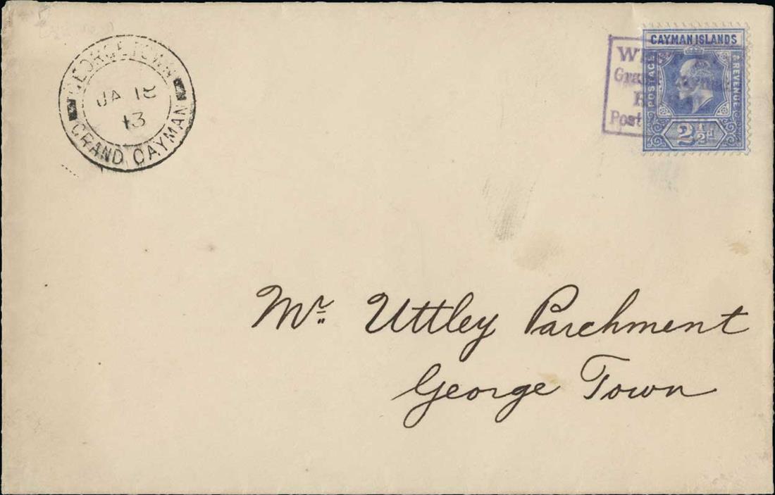 West Bay/Grand Cayman/Rural/Post Collection clear strike of this violet boxed handstamp tying 1905 2½d Ultramarine to pristine cover addressed to "Mr. Uttley Parchment, George Town," with "Georgetown/Ja 18, 13/Grand Cayman" Ty. V arrival c.d.s. at top left, extremely fine and desirable; the latest known usage of the 2½d with this cancel;