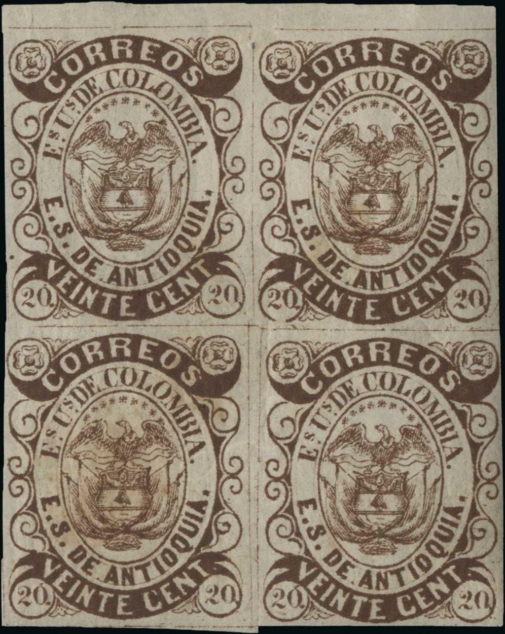 #9,1869 20c Brown, die state II, top margin mint block of four, well clear to large margins showing small portions of dividing lines on the other three sides, strong color on fresh paper, o.g., h.r. at top, light vert. gum creases typical of this this paper, very fine; only 8,000 of this value printed and a very scarce multiple of this second die state.