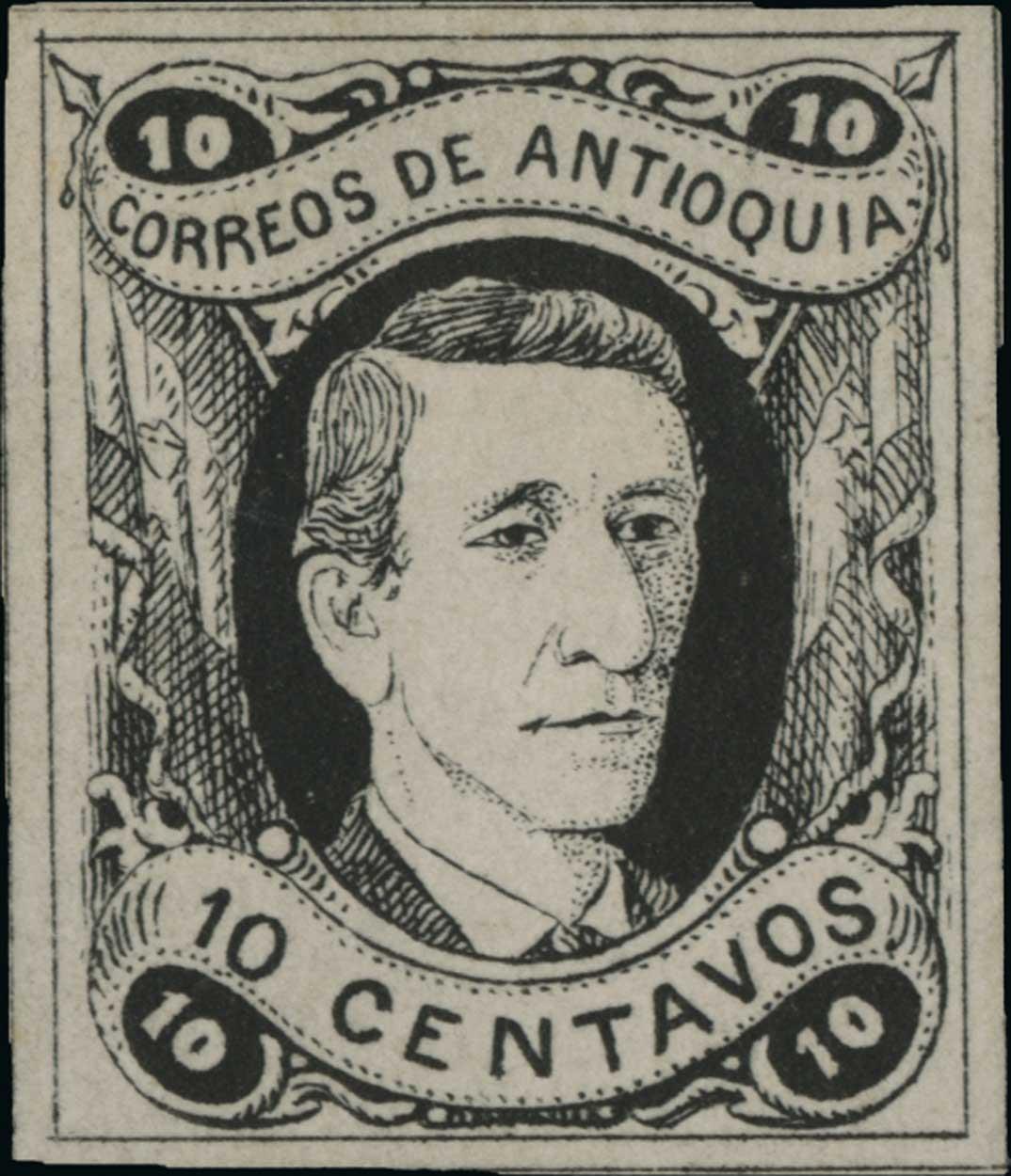 #27P, 1875 10c Pedro Justo, black proof on thin card, wide margins showing most of the dividing lines all around, very fine and very scarce.
