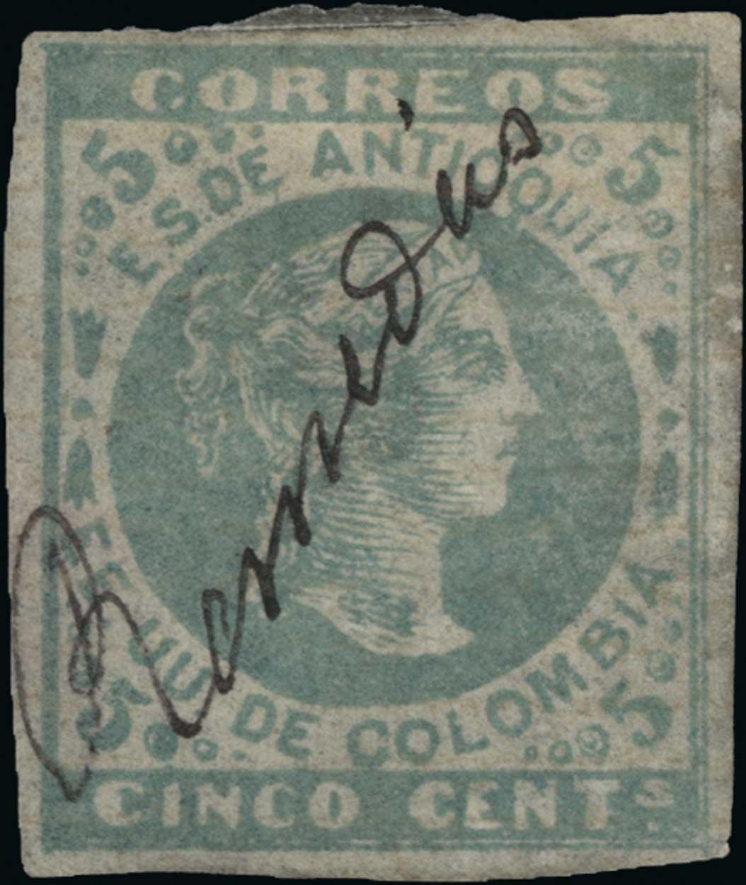 #32b, 1882 5c Green on horiz. laid paper, used single with "Remedios" ms. cancel, well clear to large margins all around, very fine; Scott lists this value on laid but does not specify the direction, for this value the normal is vertically laid, but horizontally laid paper is not specifically listed and is extremely rare; only three used examples are recorded, this being a nicer example than the one in the 2014 Tito sale.