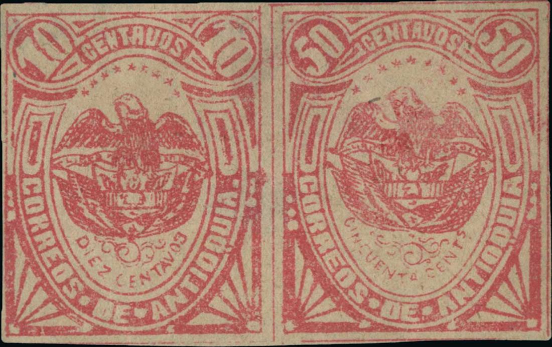 #58, 58a, 1886 10c Rose and 50c Rose on buff, se-tenant pair, attractive appearing unused horiz. pair showing the wrong 50c transfer and thus an error of color for that value, bright color on fresh paper, full to large margins all around, light hinge thins, very fine appearance; rare with only four se-tenant multiples believed to exist.