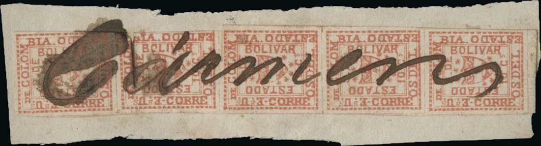 #2, 2a, 1866 10c Red, five stars below shield, vert. strip of five, the variety being the bottom stamp, tied to small piece by "Carmen" ms. cancel, strip with full to extra large margins all around, fresh color, a couple of partial scissor cuts between stamps as handled by the post office, otherwise very fine and quite rare in such a large used multiple; only 700 of the five star variety printed.