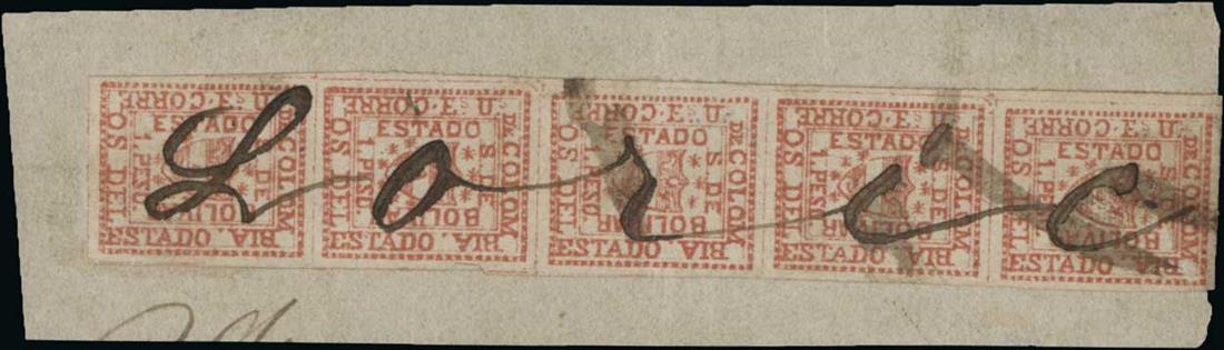 #3, 1863 1P Red, impressive vert. strip of five possessing full even margins all around, very fresh with excellent color, just tied to small piece by "Lorica" ms. cancel, extremely fine and a rare multiple of this high value.