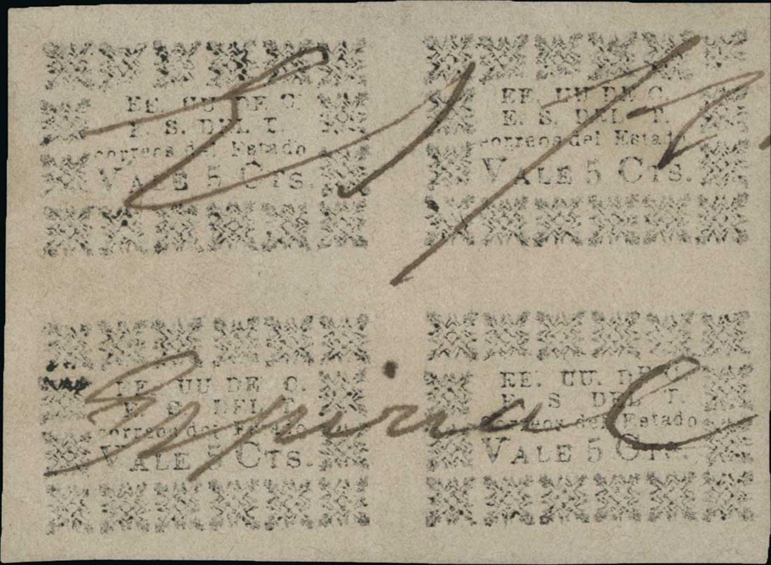Tolima #1, 1870 5c Black on white paper, lovely used block of four, wide balanced margins all around, extremely fine; a rare and attractive multiple of this #1 first issue stamp; signed W. Shelton.