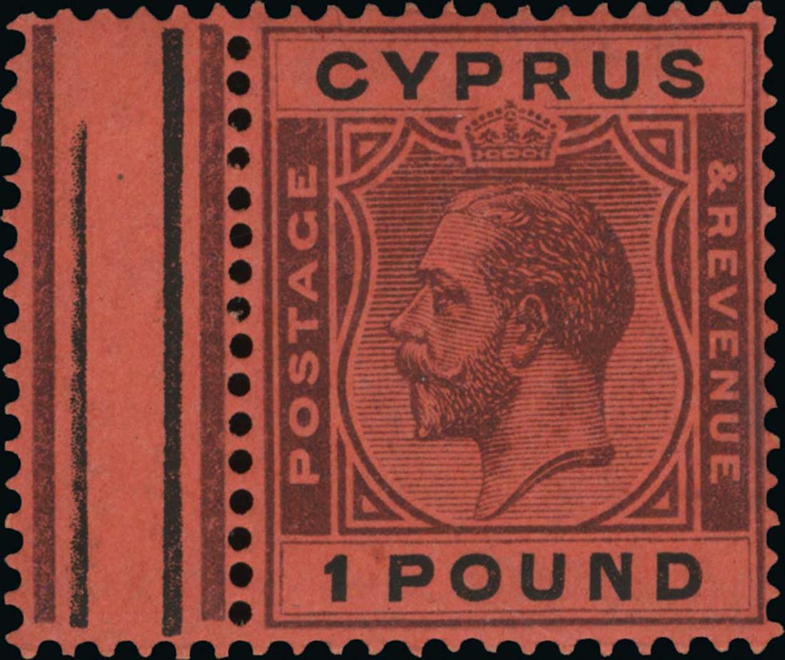 #110, 1924 £1 Violet and black on red, left gutter margin single, intense colors on fresh paper, o.g., barest trace of hinging, very fine (S.G. #102; £300).