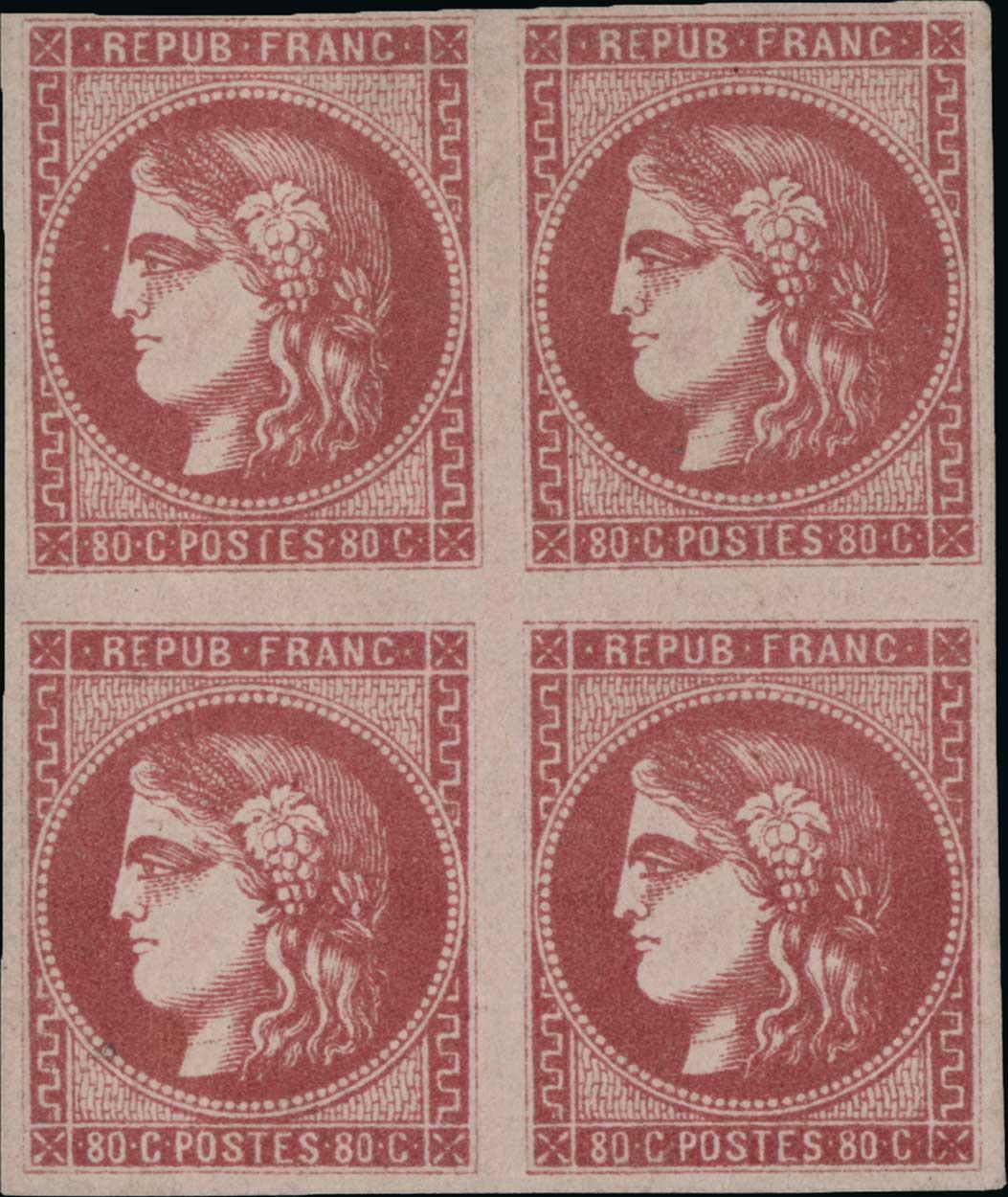 #48b, 1870 80c Bright rose on pinkish, handsome and scarce mint block of four, ample to mostly large margins all around, lovely bright color on uncommonly fresh paper, full clean o.g., light h.r. at top, the bottom stamps very lightly hinged, very fine and choice; signed "AD" and "ED" (Diena) and accompanied by 1985 Enzo Diena certificate (Yvert #49b).