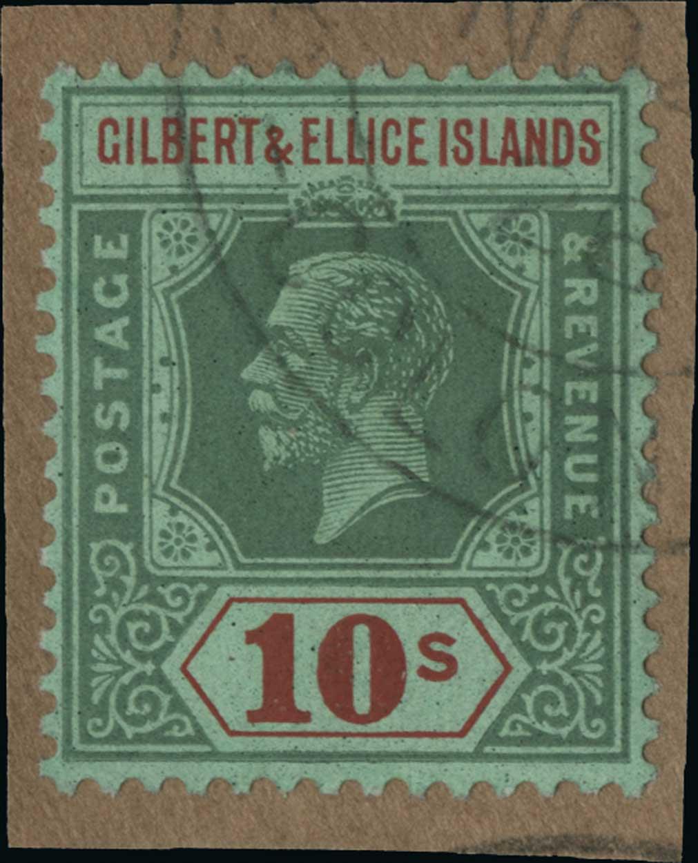 #31, 1921 10/- Green and red on emerald, tied to piece by double circle November 1928 c.d.s., very fine and scarce; 1999 BPA certificate (S.G. #35; £375).