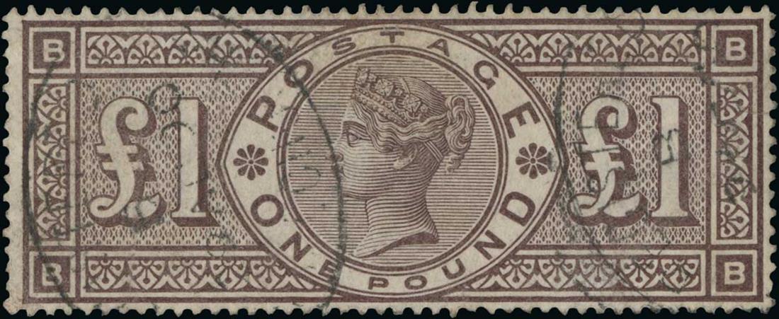#110, 1884 £1 Brown violet, watermarked three crowns, used with relatively light oval registry postmarks, well centered, rich color on fresh paper, pressed-out corner crease at top left not noted on the certificate, otherwise very fine; clear 2010 Garanzia certificate (S.G. #185; £2,800).