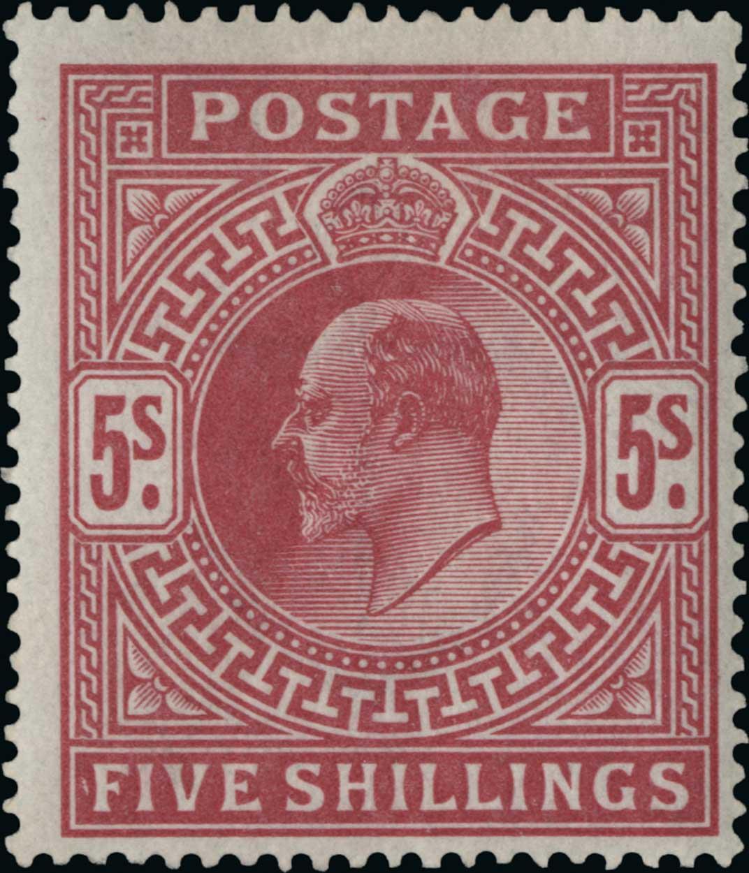 #140, 1902 5/- Carmine rose, De La Rue printing, wonderfully fresh with bright color, o.g., n.h., very fine; 2008 Raybaudi certificate (S.G. #263; £850).