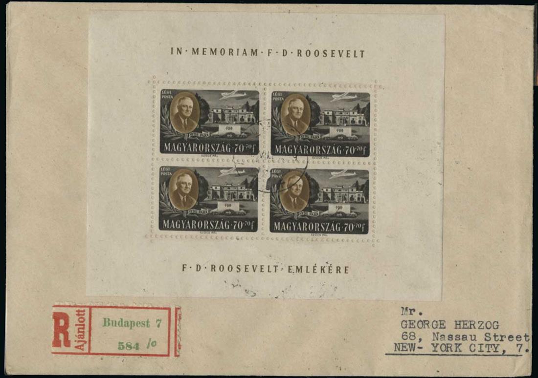 #B198A-D, CB1-1C, 1947 Franklin D. Roosevelt and Four Freedoms Allegories perforated sheets of four cplt. set of eight regular and airmail semi-postal sheets, each 117x96mm, each on 1948 registered cover to New York, each bearing additional 1947 20f (#819) and 1948 2fo (#837) on reverse, small portion of backflap of each cover excised, an attractive set nevertheless, very fine.