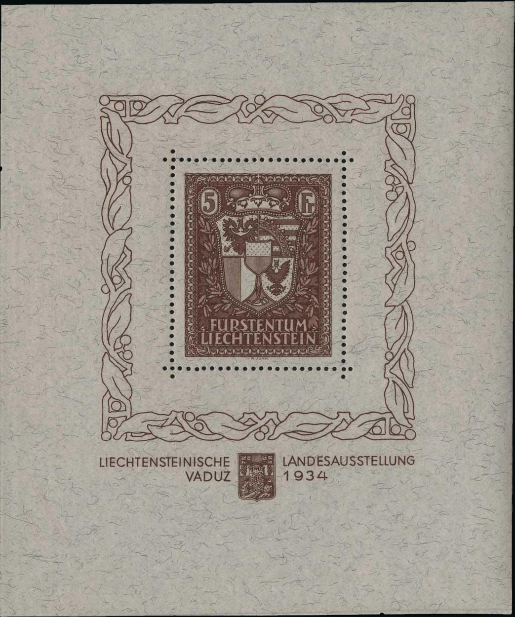 #115, 1934 5Fr Vaduz souvenir sheet, choice mint example, o.g., n.h., extremely fine.