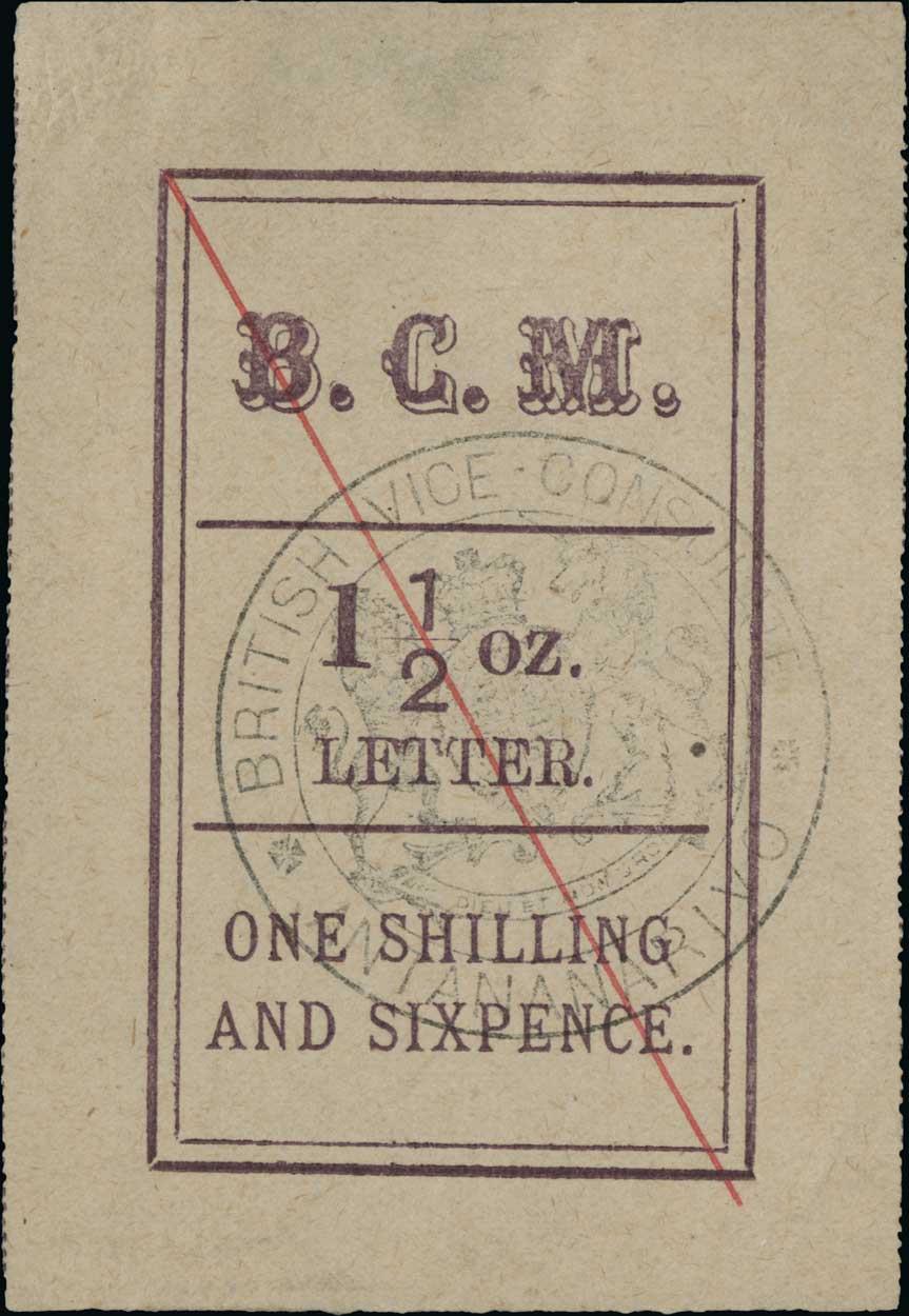 #7, 1884 1/6 Violet, used with red diagonal line pre-cancel applied for accounting purposes, as is evident by the presence of o.g. in the top left corner, shallow thinned spot, very fine appearance (S.G. #3; £500).