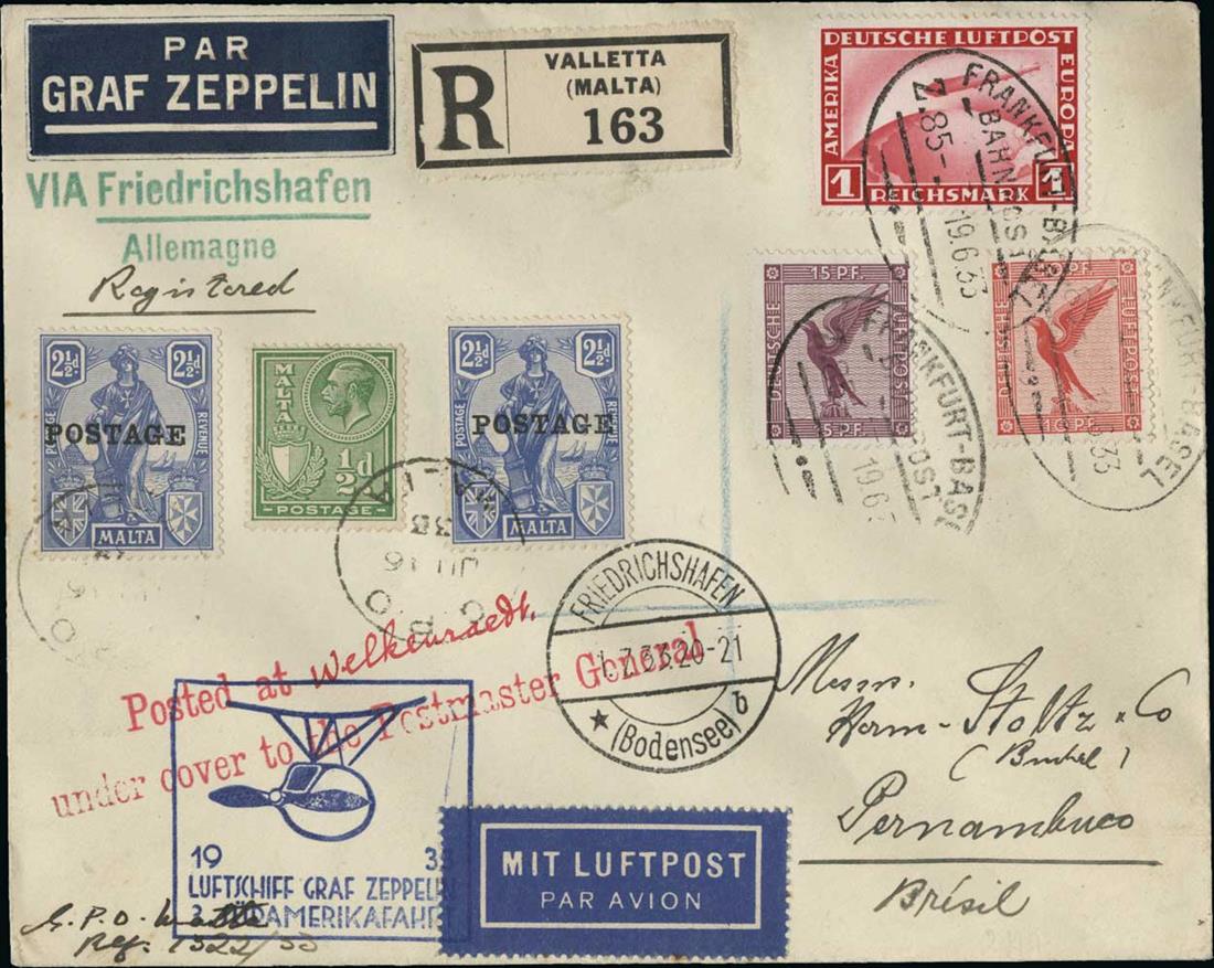 Sieger #219Aa var., 1933 Third South America Flight, attractive mixed franking registered cover with three Malta adhesives tied by "G. P. O./Malta/JU 16 33" c.d.s., violet flight cachet, then three German air posts, including 1M Zeppelin single, tied by "Frankfurt-Basel/Bahnpost/Z. 85- 19. 6. 33" oval railroad cancels, Friedrichshafen transit c.d.s., backstamped Pernambuco, very fine; highly unusual and the first example of this posting we have seen with mixed franking (Sieger €600 for normal franking; Michel #315a var.).