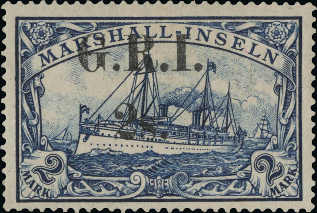 #40, 1914 "G.R.I./2s." overprint on Marshall Islands 2M Blue, narrow 4mm setting, strong rich color on fresh white paper, nicely centered, o.g., very fine; an attractive example of this very scarce stamp, of which only 200 were overprinted; 1955 BPA certificate (S.G. #60; £1,900).