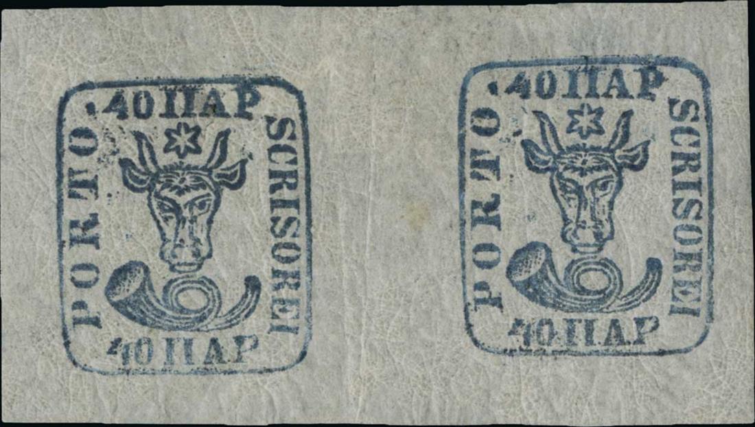 #9, 1859 40pa Blue on white wove paper, handsome and fresh horizontal pair, huge margins all around, strong color and impression, full clean o.g., lightly hinged, faint vertical crease between the stamps, otherwise extremely fine; signed.