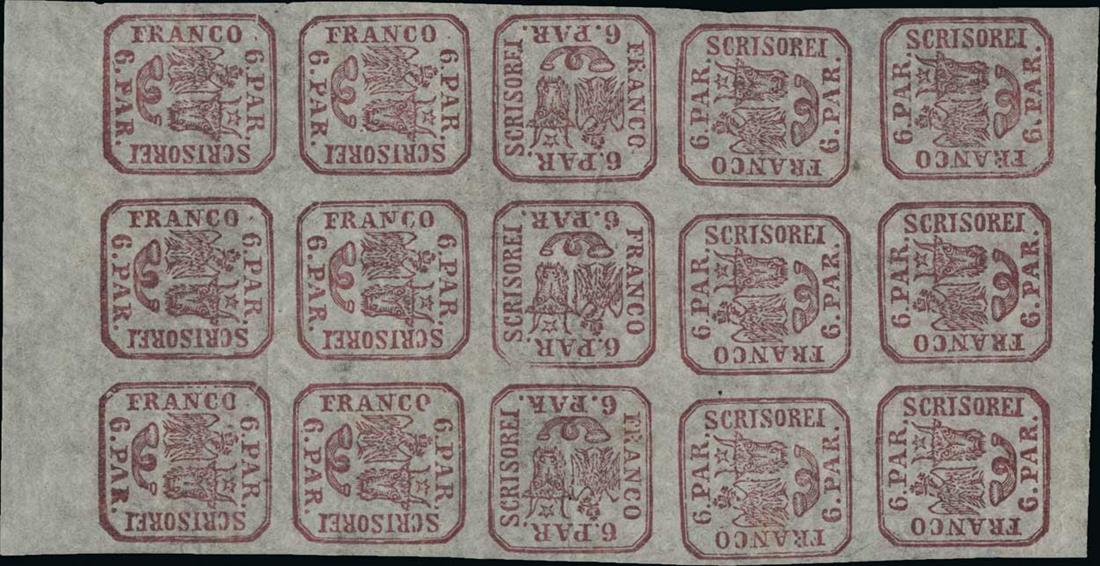 #20, 1864 6pa Deep rose, fresh mint block of fifteen (3x5), the top two rows with inverted cliches, the center three cliches sideways, yielding three pairs with one stamp sideways (#20b), and the bottom two rows normal, full clean o.g., l.h. or mostly n.h., very fine.