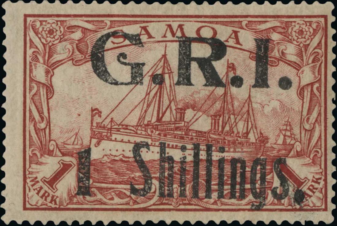#110, 1914 "G.R.I./1 Shillings" surcharge on 1M Carmine, strong fresh color, o.g., small h.r., typical tropical characteristics of the occupation stamps and tiny spot of gum missing at lower left, nearly very fine and rare; only 100 stamps were surcharged; signed Bothe and accompanied by his 1983 certificate (S.G. #110; £3,250).