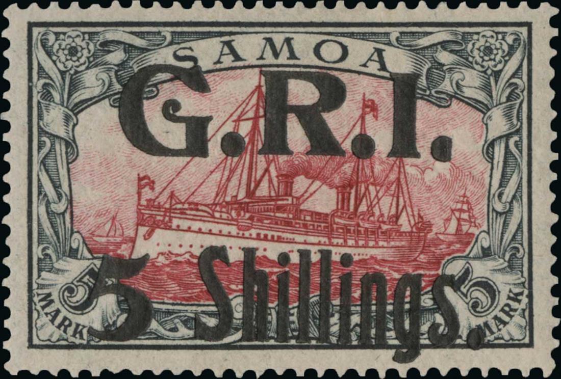 #113, "G.R.I./5 Shillings" Surcharge on 5M Slate and carmine, handsome mint example of this scarce stamp, nicely centered and incredibly fresh, with luxuriant colors on bright white paper, o.g., very lightly hinged, very fine; only 534 stamps were surcharged; signed Bloch and accompanied by 1962 RPS certificate (S.G. #114; £1,200).