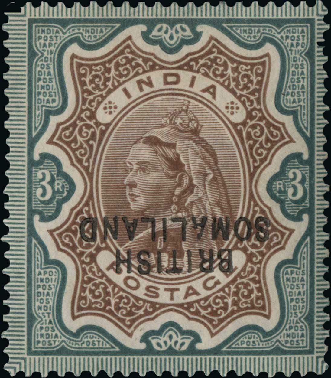 #18a, 1903 3R Green and brown, double "British Somaliland" overprint, both inverted, one albino, select mint example of this rare error, o.g., very lightly hinged, very fine; signed Bloch (S.G. #23a; £950).
