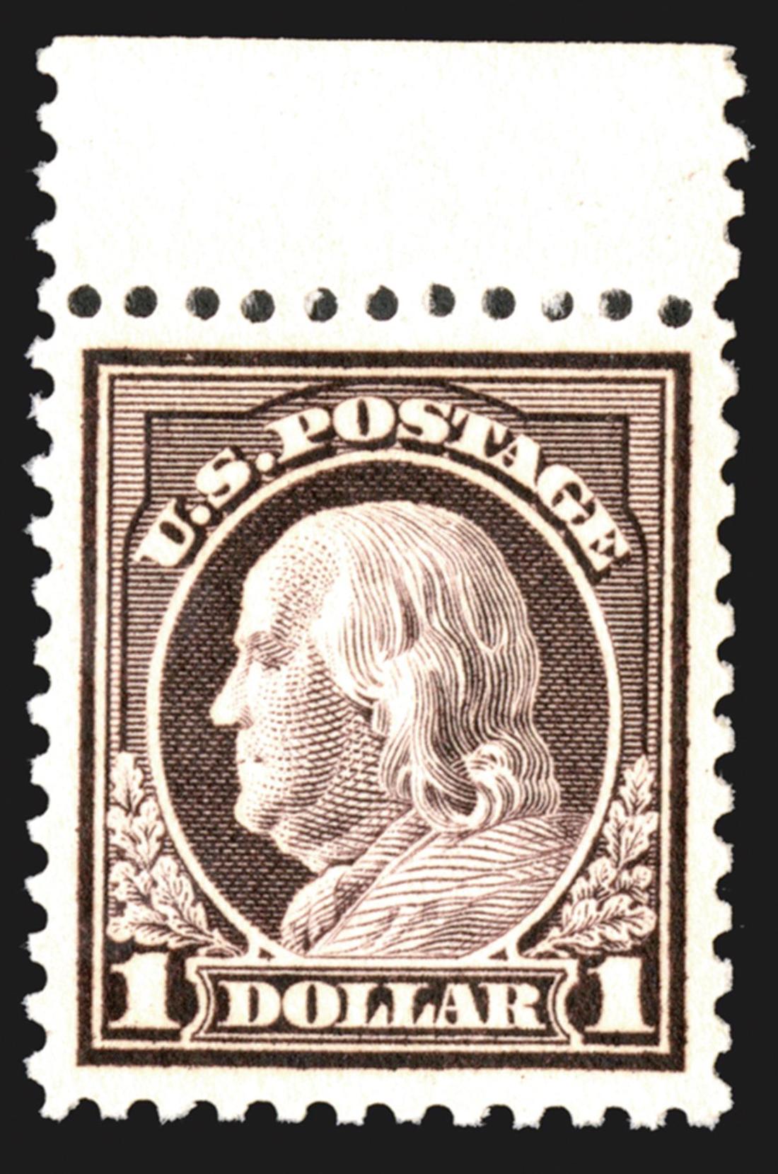 #518, $1.00 Violet brown, handsome top sheet-margin mint single, exceptionally well centered within generous balanced margins, o.g., n.h., an extremely fine gem; 2016 PSE certificate (XF-Sup 95; SMQ $525.00).