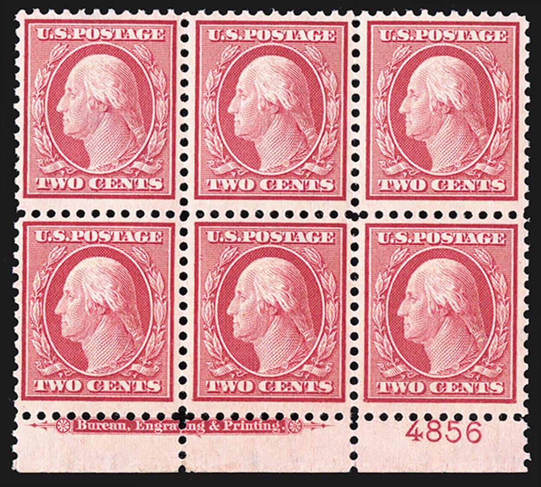#519, 2c Carmine, fresh bottom margin imprint and plate no 4856 block of six, nicely centered for this, o.g., n.h., a couple perf. separations in the bottom selvage only not noted on the certificate, very fine and rare; clear 2005 PSE certificate.