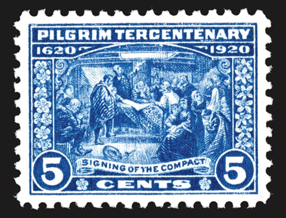 #550, 5c Pilgrim Tercentenary, an incredibly choice mint single, near perfect centering within beautifully balanced margins, post office fresh, pristine o.g., n.h., an extremely fine gem with few peers; 2016 PSE certificate (Superb 98; SMQ $1,575.00).