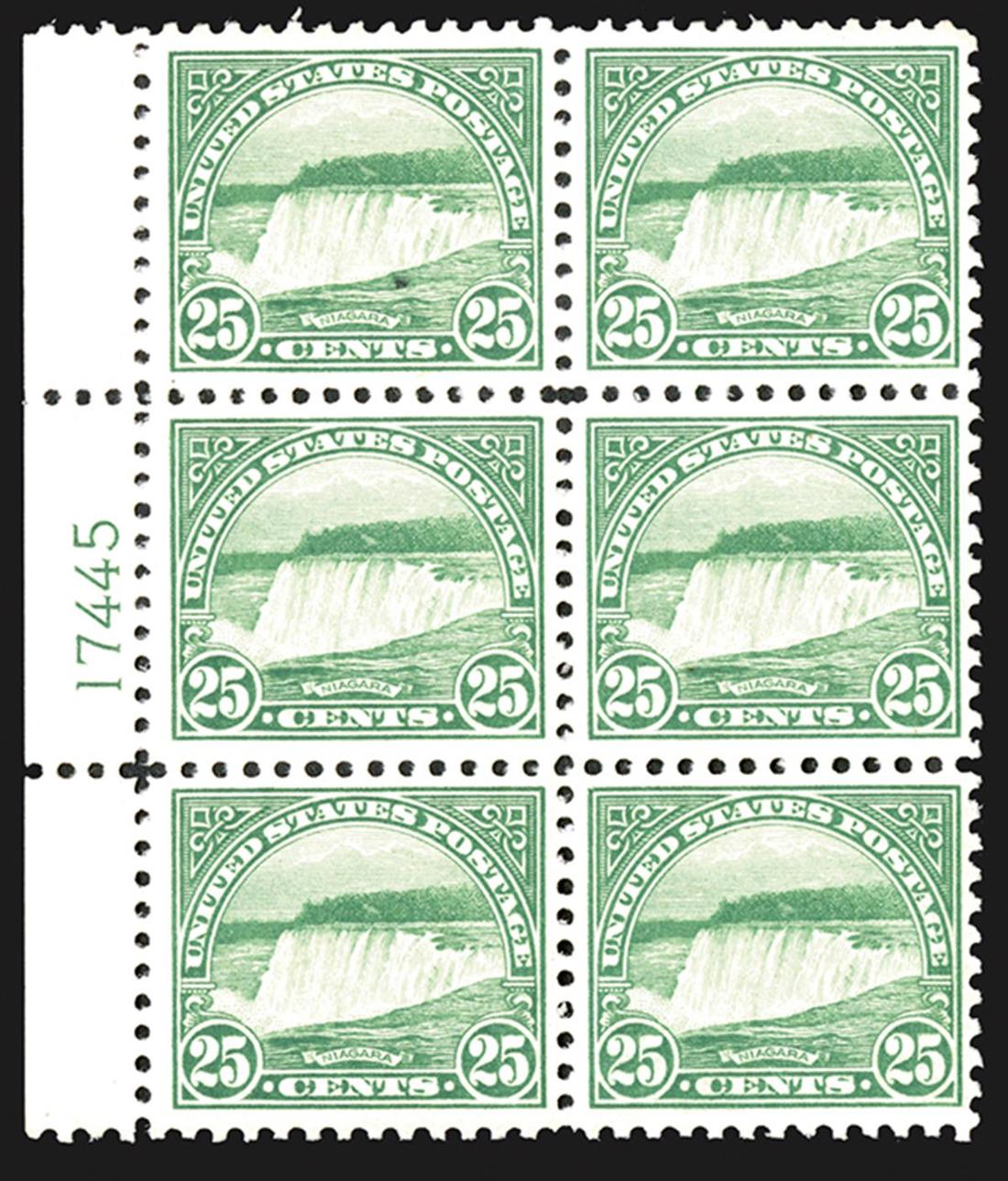 #568, 25c Yellow green, left margin plate no. 17445 block of six, wonderfully well centered, rich color, fresh and intact, o.g., n.h., choice very fine.